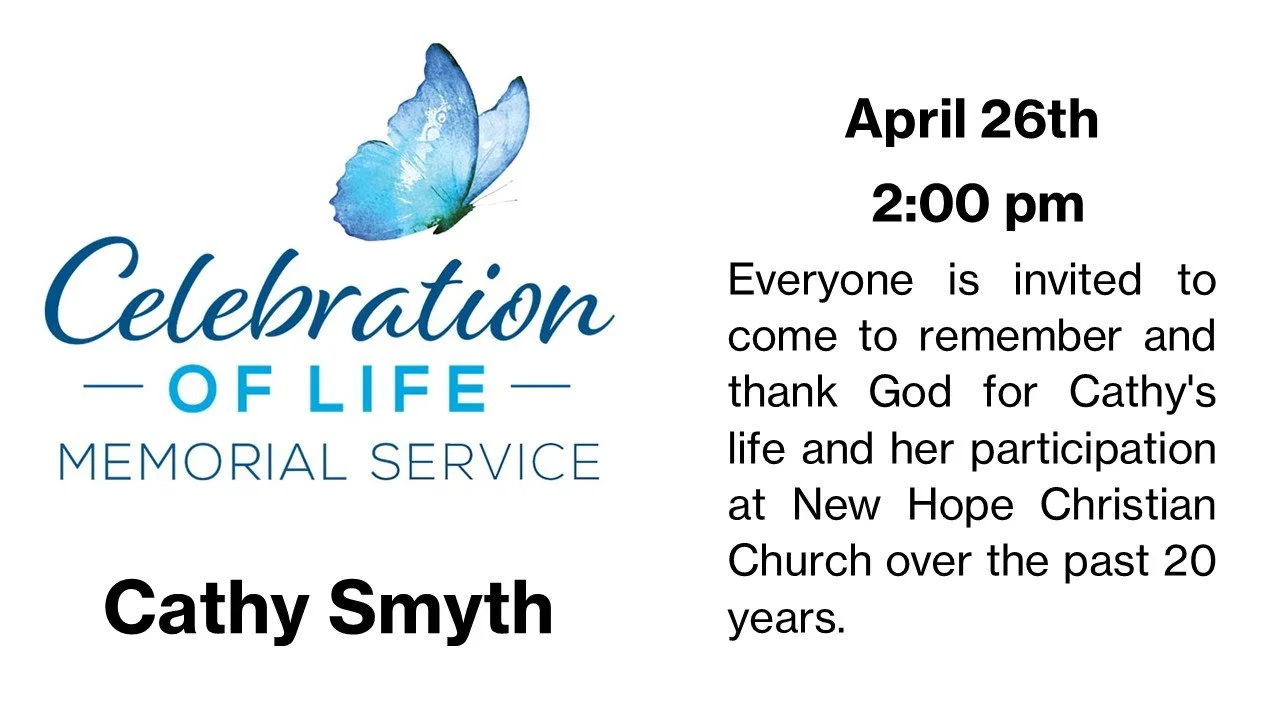 Celebration of Life for Cathy Smith Apr 26 Written By Mediaspace 10:30 a.m. in person and online New Hope Streaming Mediaspace https://mediaspace.co